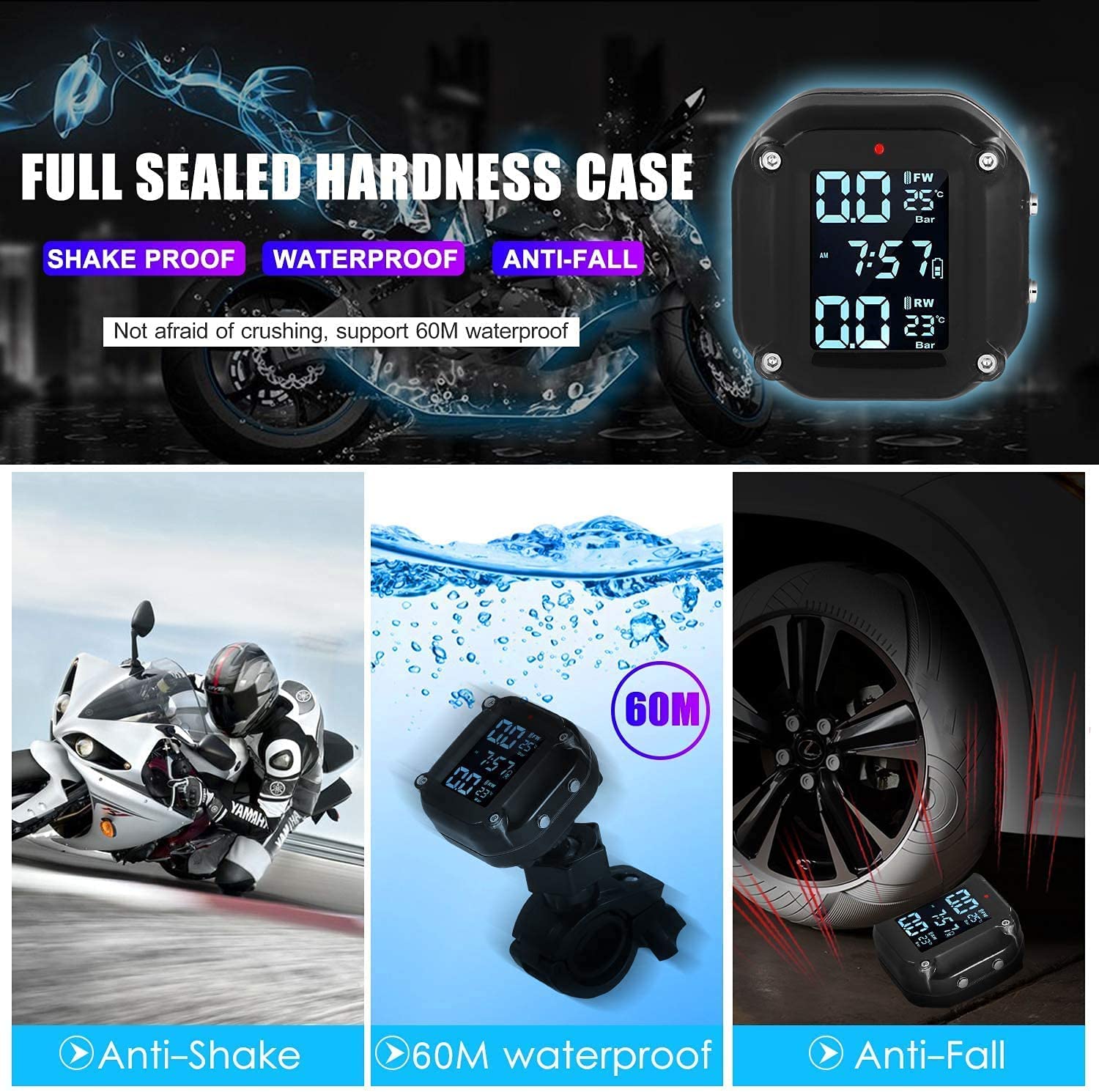The function of this tire pressure monitoring system is to warn tire conditions in advance and monitor tire pressure and temperature in real time, so that you can get more protection during riding.